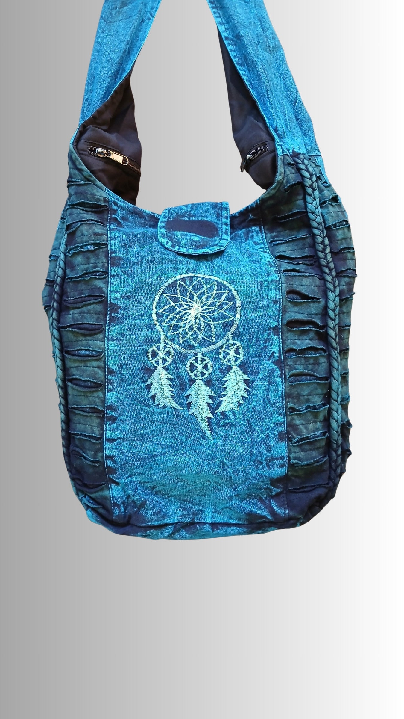 Large stonewashed cotton hippy boho bag with embroidered flower design, it has a zip pocket inside and one on the back, also zip and magnetic pop stud to close main compartment.