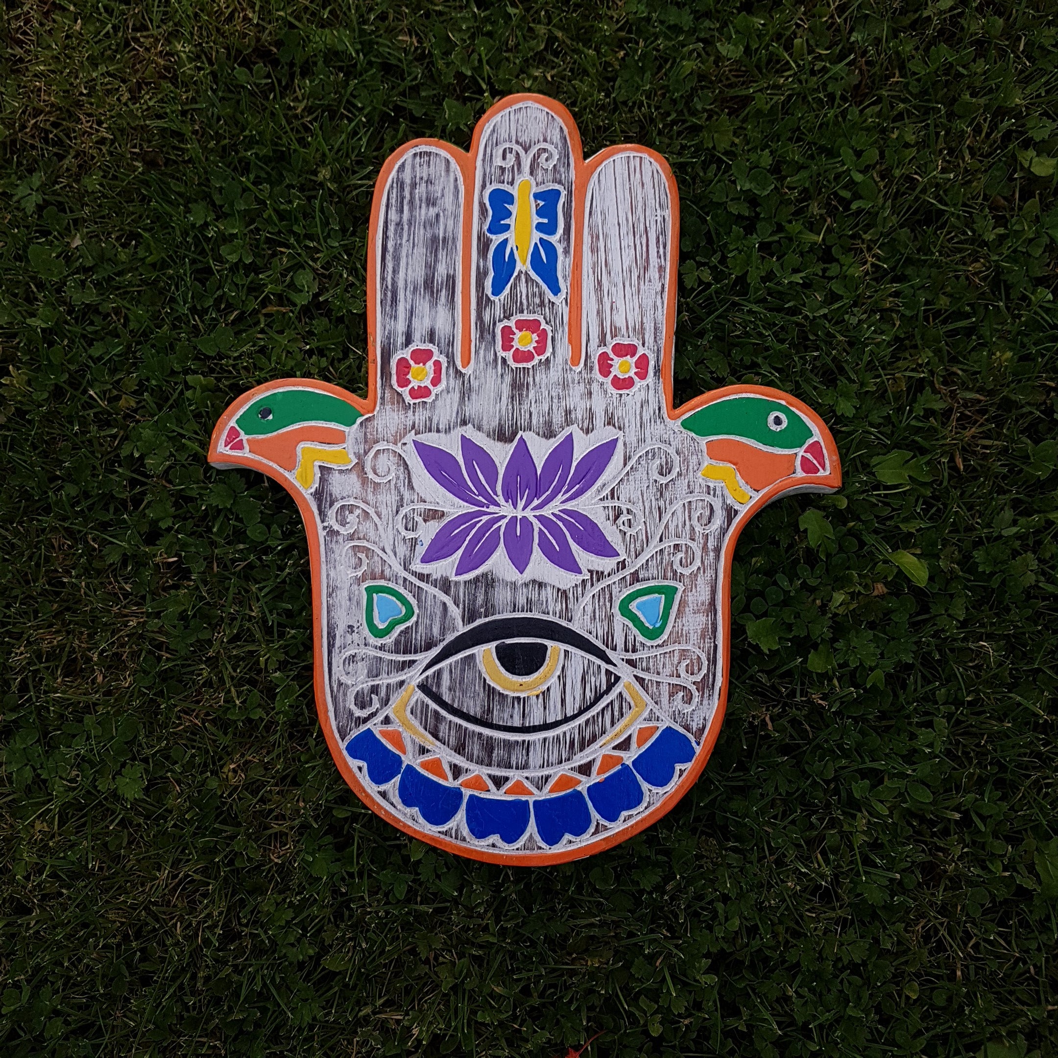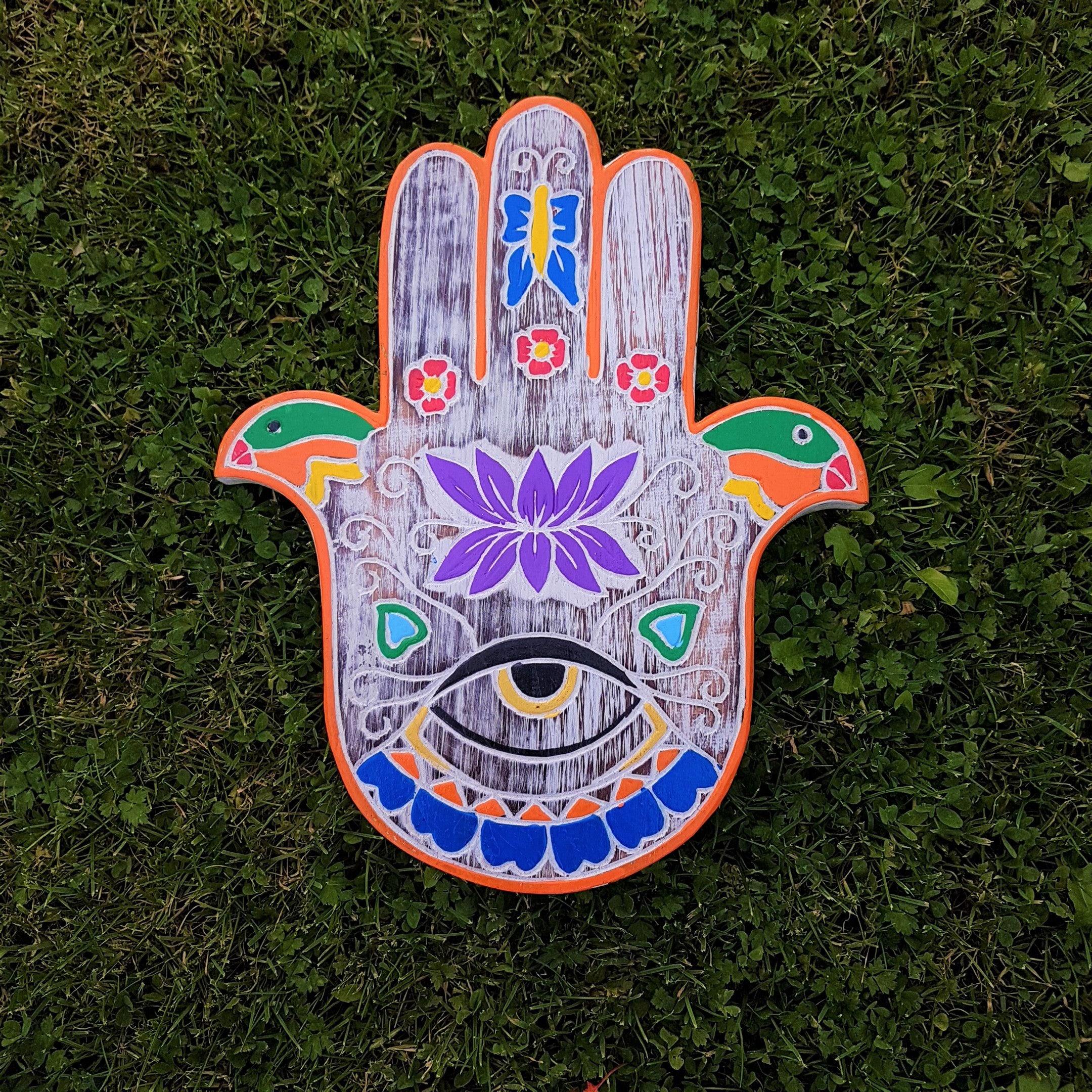 Hand Carved Painted Wall Plaque Hand of Fatima Yoga Meditation Gift