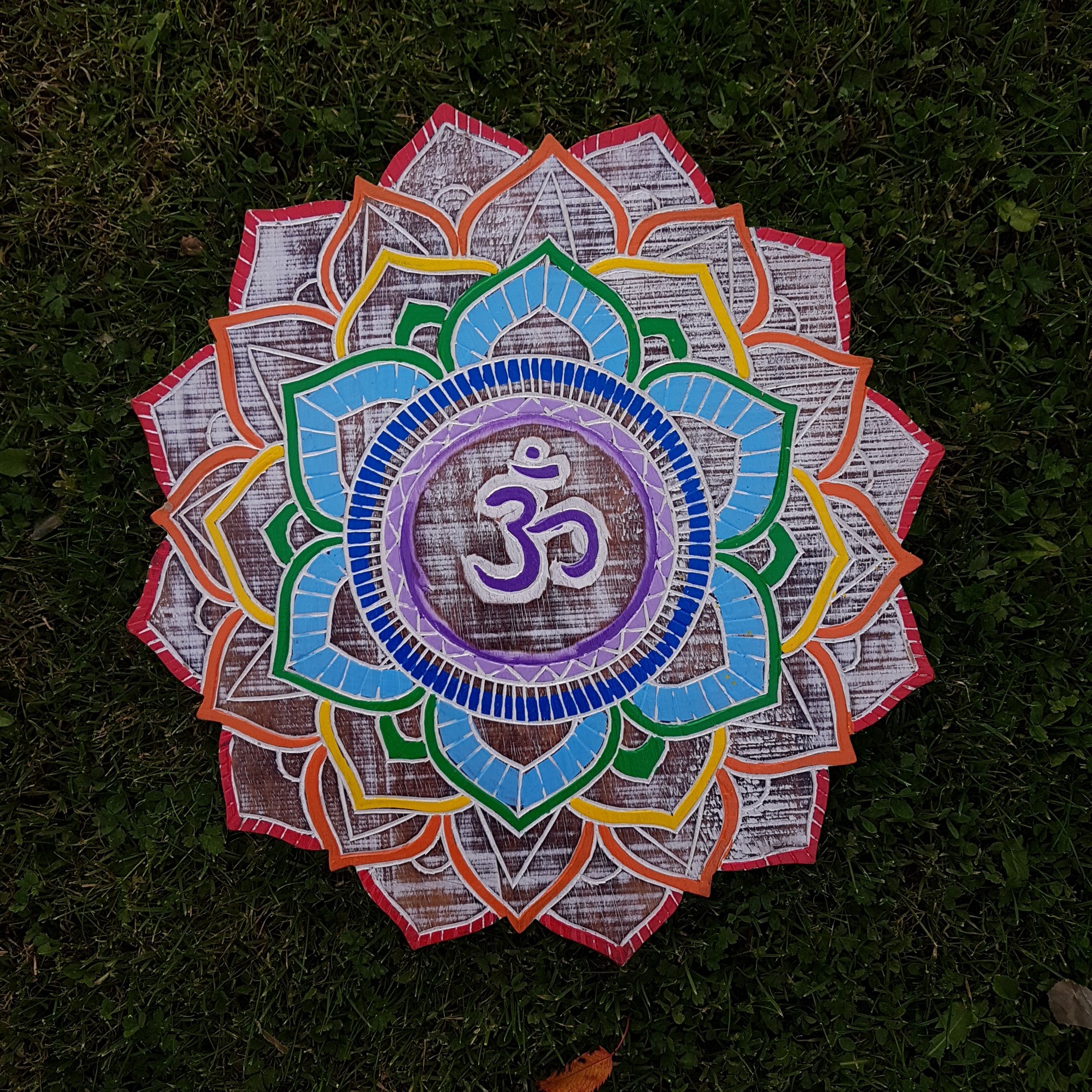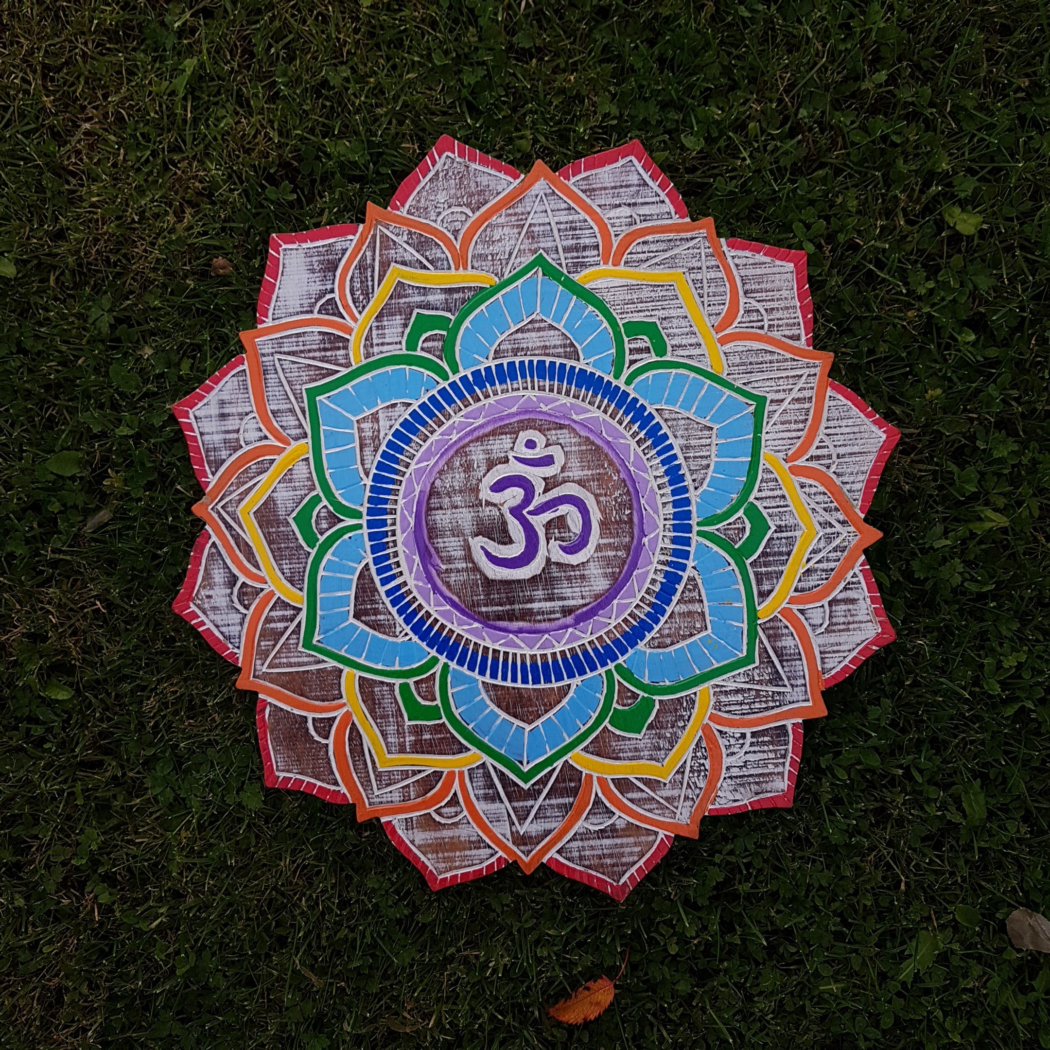 Hand Carved Painted Wood Om/Aum Mandala Wall Plaque Yoga Meditation